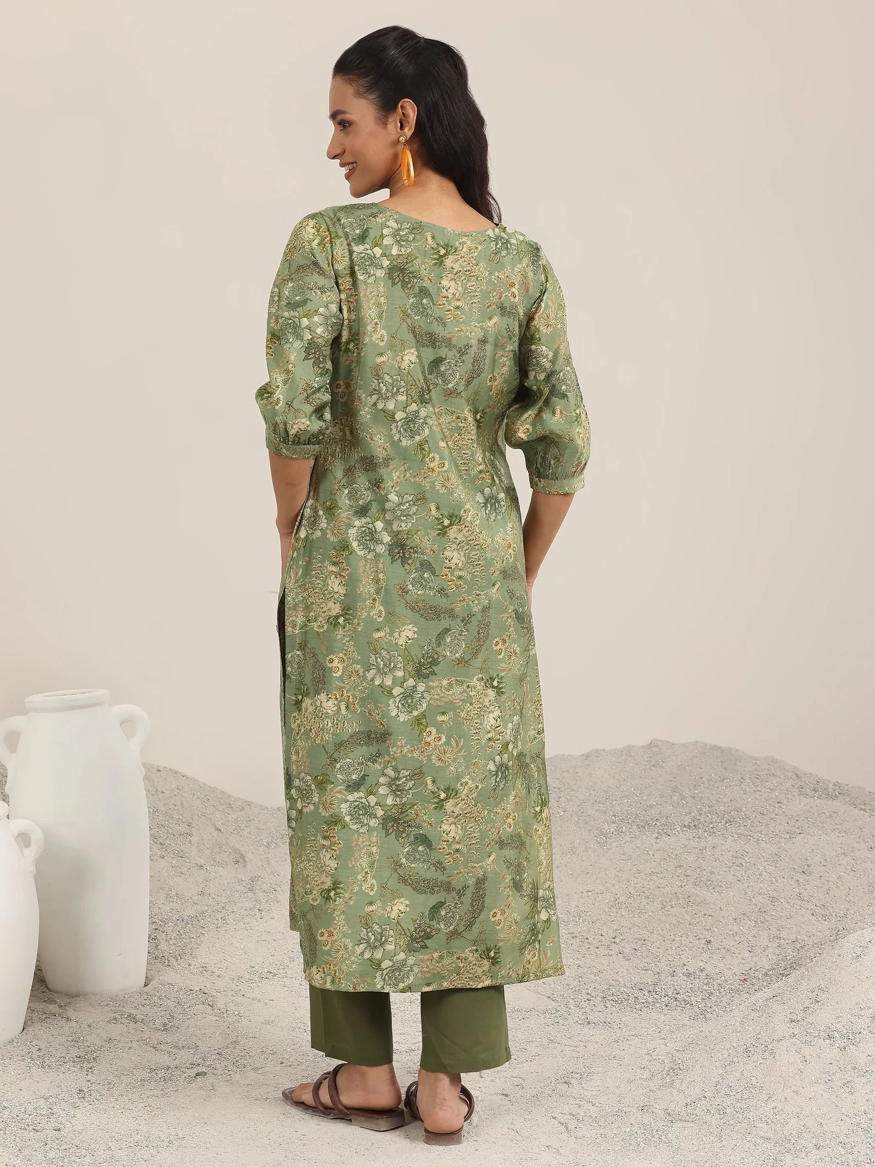 Green Printed Silk Blend Straight Kurta